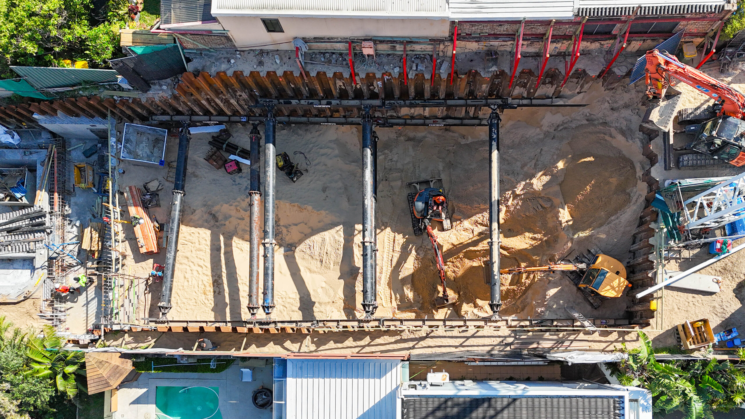 With close neighbouring boundaries and wind-blown, super fine sand, which brings a whole set of challenges – lack of cohesion, high risk of sudden collapse, high permeability, and risk of erosion behind shoring system. And because fine sands are tricky to compact uniformly, careful control is required to avoid settlement issues.